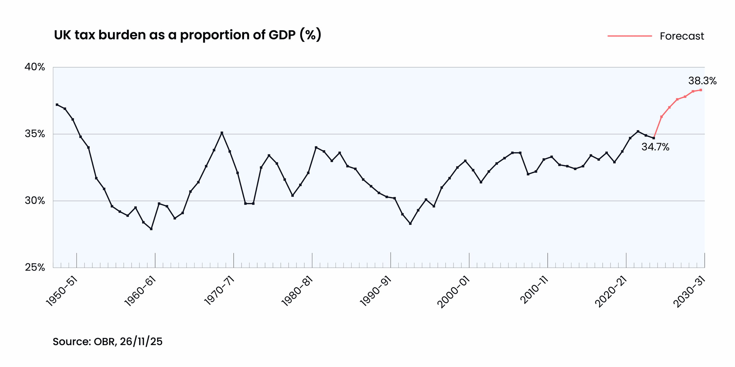 Not a friend, this trend… The UK tax take as a proportion of national wealth is set to rise to historic highs. Increased levels of tax take are being relied on heavily by the government to tackle debt and fund expenditure. Returning to a tax and spend could impact the UK’s competitive positioning for both investment and growth.