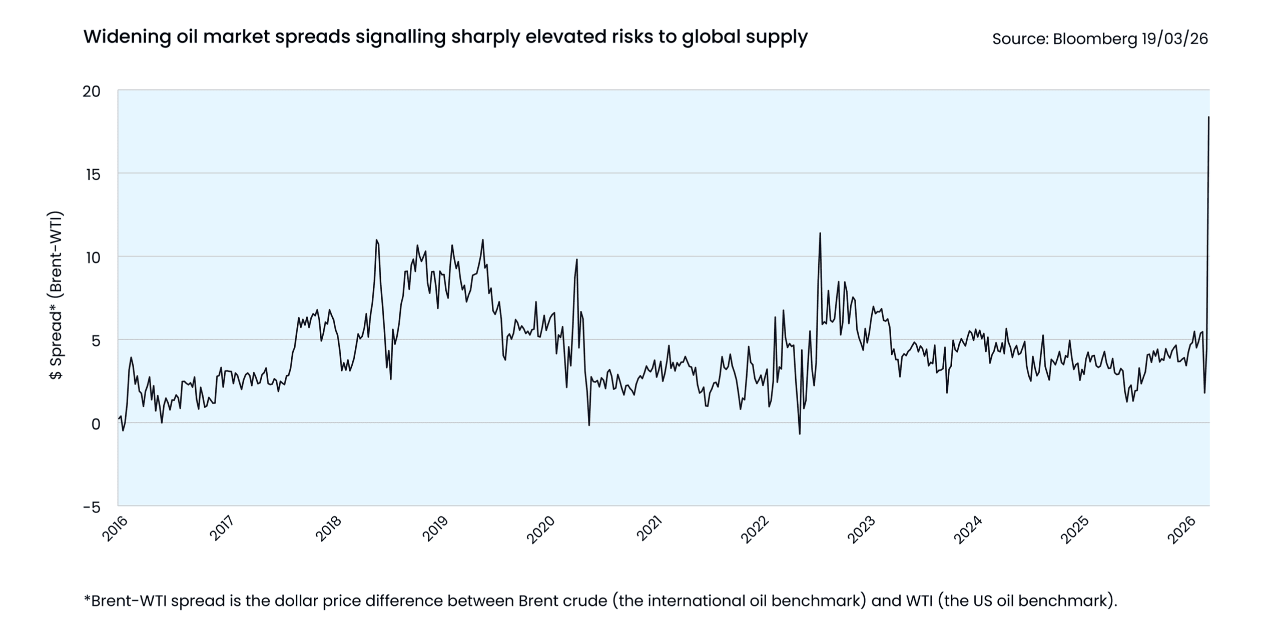 The continued conflict in Iran has had a huge effect on the price difference between international Brent and US WTI oil prices. This reflects the geopolitical energy disruption vulnerability in Europe and Asia compared to the US.